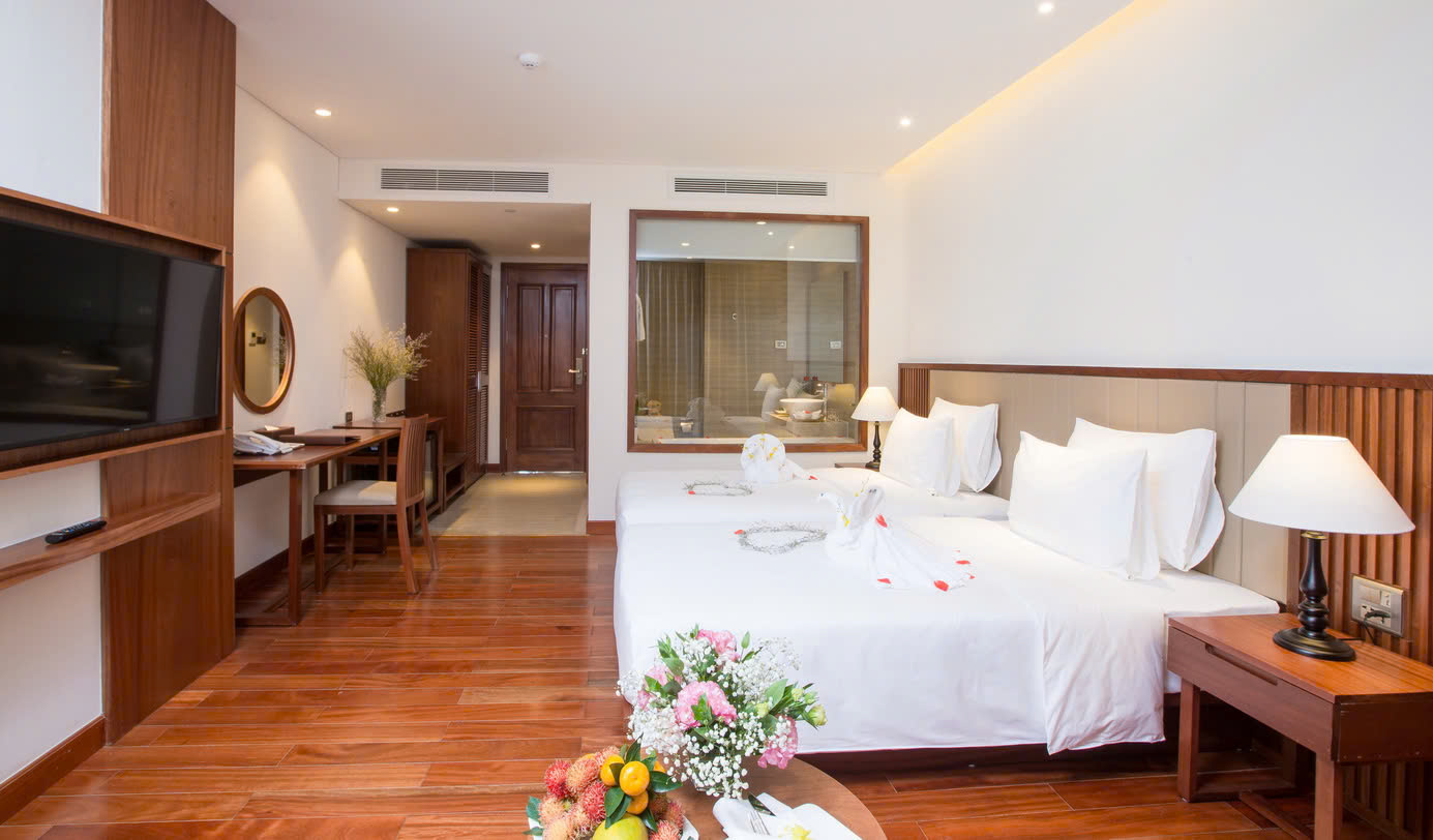 Tiện nghi trong phòng: 2 giường (1m2), điều hòa, TV, bàn làm việc, tủ quần áo, minibar, két sắt, bồn tắm nằm, wifi miễn phí.